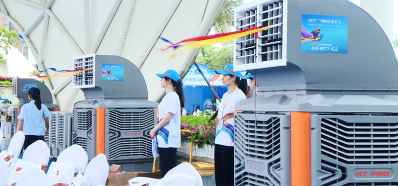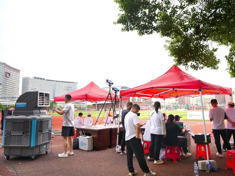 本次活动期间,瑞泰风经过现场实地考察,科学规划,一次性投放了30套移动冷风机设备,其中包括经典版和体育版两个系列产品,降温效果显著,安装使用也非常便捷,确保各项室内、户外赛事活动的顺利开展。移动冷风机是一款节能环保的降温设备,尤其适合户外使用,仅需2分钟即可将35℃的高温降低到26~27℃,达到人体最舒适,也是多类体育项目最适宜的温度环境。此外,移动冷风机送风距离远,覆盖范围广,单台设备的送风距离可达30米,并且有效覆盖120°扇形区域。